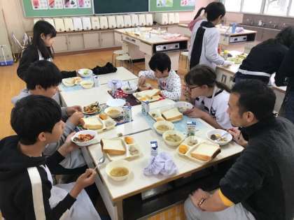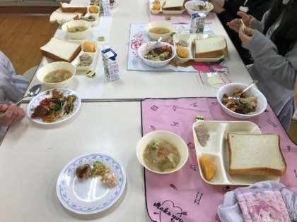 給食と一緒に、それぞれの班で作ったおかずをブッフェ形式で少しづつ食べました。