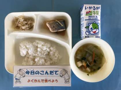 1月10日(金)の献立は「さばのみそ煮・すまし汁・もやしのゆずの香あえ・ごはん・牛乳」でした。