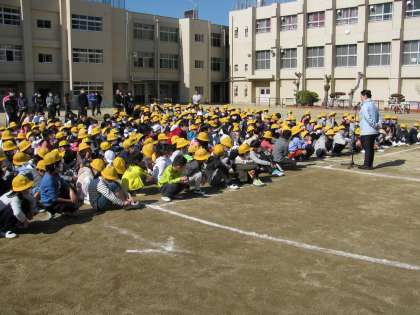 「避難、はじめ」の合図から、運動場に全児童が避難します。話をしたり笑ったりする様子もなく、全児童が真剣な表情で避難をしました。日ごろから、もしもの時に備えておくことは大切です。校長先生の話をみんなで聞き、自分がどう行動したらよいか考えました。