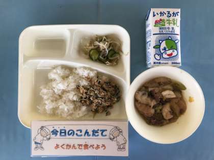 2月18日(火)の献立は「すきやき煮・もやしときゅりのしょうがづけ・ツナっ葉いため・ごはん・牛乳」でした。