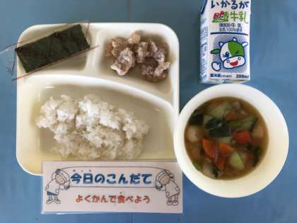 2月19日(水)の献立は「鶏肉のからあげ・まる天と野菜のうま煮・焼きのり・ごはん・牛乳」でした。