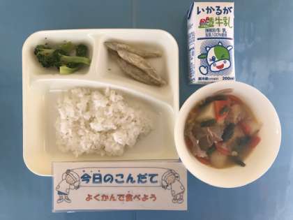 2月27日(木)の献立は「きびなごてんぷら・一口がんもとじゃがいもの煮もの・ブロッコリーのごまあえ・ごはん・牛乳」でした。