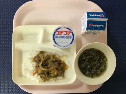 今日の給食は「和風カレー丼・もずくとオクラのとろり汁・ヨーグルト・牛乳」でした。