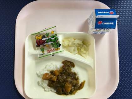 今日の給食は「夏野菜のカレーライス・キャベツのサラダ・豆こんぶ・牛乳」でした。
