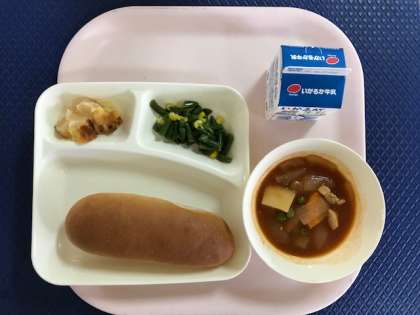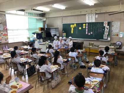給食当番さんが、献立を読み上げてみんなで「いただきます」をします。
