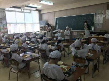 夏休み明けの給食でしたが、1年生もスムーズに準備して「いただきます」をしました。