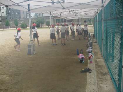 (1枚目)4年生 体育の時間です。テントの下で休憩をとりながら、学習しています。