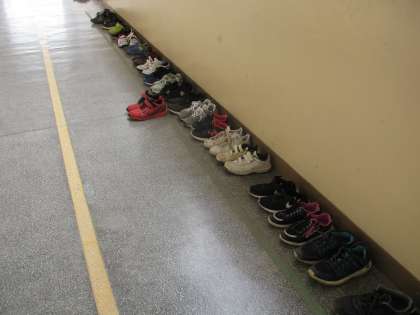 (3枚目)6年生 音楽の時間です。音楽室の前には、くつがきれいに並んでいました。