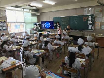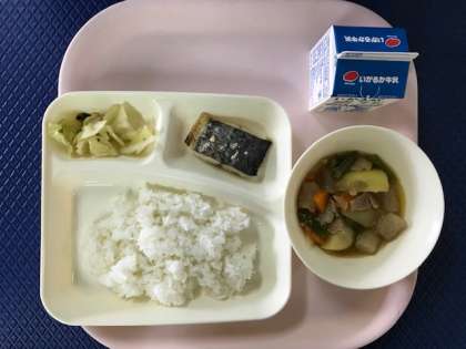 今日の給食は「さごしの塩焼き・豚肉とじゃがいもの煮もの・キャベツの梅風味・ごはん・牛乳」でした。