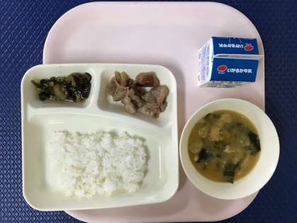 今日の給食は「鶏肉のてり焼き・みそ汁・なすのそぼろいため・ごはん・牛乳」でした。