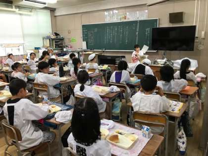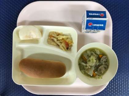 今日の給食は「鶏肉とてぼ豆のスープ煮・じゃがいもとトマトのチーズ焼き・なし(二十世紀)・黒糖パン・牛乳」でした。
