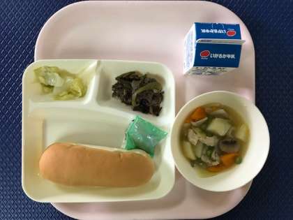 今日の給食は「牛肉の香味焼き・スープ煮・サワーキャベツ・コッペパン・りんごジャム・牛乳」でした。