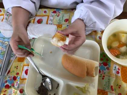 マナーよく、添加物のりんごジャムをちぎったパンにつけて食べていました。手をべとべとにせず上手に食べていました。