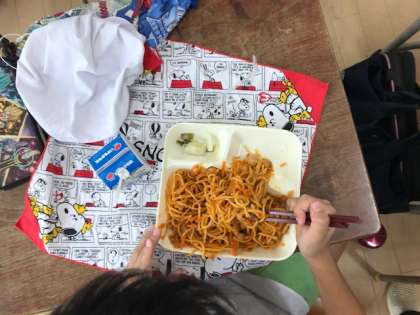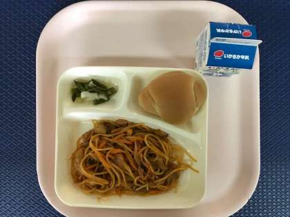 今日の給食は「イタリアンスパゲティ・グリーンアスパラガスとキャベツのサラダ・1/2黒糖パン・牛乳」でした。