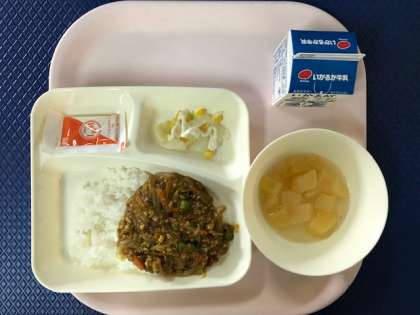 今日の献立は「大豆入りキーマカレーライス【米粉】・キャベツとコーンのサラダ〔ノンエッグドレッシング〕・白桃(カット缶)・牛乳」でした。
