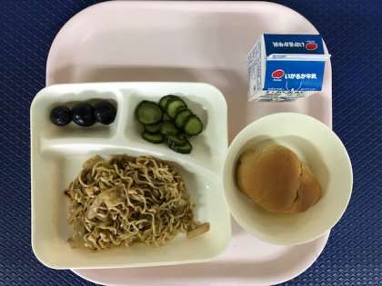 今日の給食は「焼きそば・きゅうりのしょうがづけ・ぶどう(巨峰)・1/2黒糖パン・牛乳」でした。