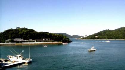 水族館から海を見ると、写真の左に、ミキモト真珠島が見えます。