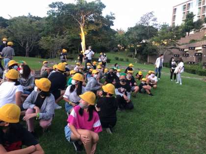 部屋割りの後、避難訓練をし、緊急時の安全な場所への経路を確認しました。