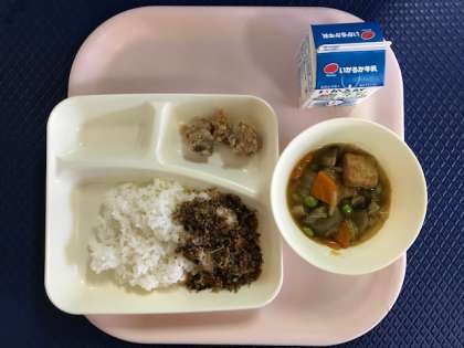 今日の給食は「鶏肉のたつたあげ・あつあげと野菜の煮もの・おかかなっ葉・ごはん・牛乳」でした。