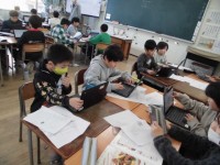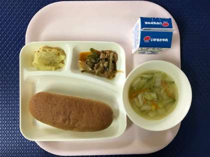 今日の給食は「豚肉と野菜のケチャップソテー・スープ・スイートポテト・ライ麦パン・牛乳」でした。