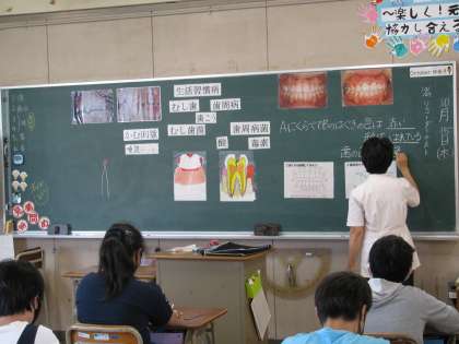 6年生で、学校歯科医・森川先生と歯科衛生士さんによる「歯と口の健康教室」がありました。歯磨きの大切さだけでなく、好き嫌いなくバランスよく食べることなど、生活習慣の大切さを学びました。