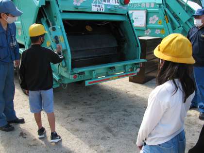 はじめは、ごみの分別についての学習をしました。その後、安全な仕事のためのパッカー車の工夫を聞いて、実際にごみを投入し、収集ボタンを操作する体験をしました。