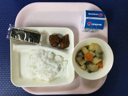 今日の給食は「みそカツ・じゃがいもと野菜の煮もの・焼きのり・ごはん・牛乳」でした。