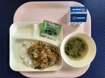 今日の給食は「ピリ辛丼・中華スープ・ソフト黒豆・牛乳」でした。