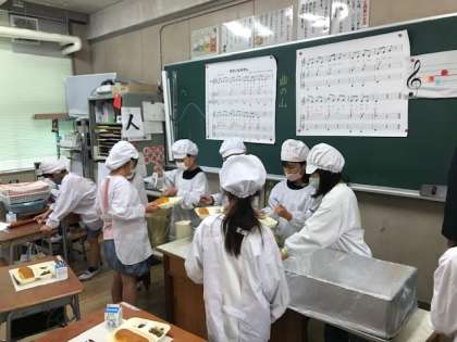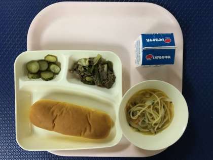 今日の給食は「牛肉のカレー風味焼き・ほたて貝とトマトのスープスパゲティ・きゅうりのサラダ・パンプキンパン・牛乳」でした。
