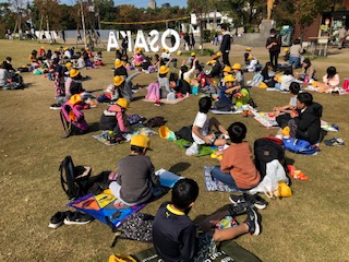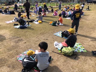 ハルカスの見学の後は、てんしばに移動し、お弁当の時間です。友だちと間隔をとりながらシートを広げ、楽しくいただきました。みんなのニコニコ笑顔がいっぱいでした。