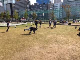 “広い公園で思いっきり走り回る”とはいきませんが、きれいな芝生のうえで友だちとのお話を楽しんだり、馬跳びや側転をして体を動かしたりして、自由時間を楽しみました。