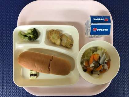 今日の給食は「白身魚のフリッター・洋風煮・ブロッコリーのサラダ・コッペパン・バター・牛乳」でした。