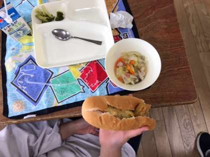 コッペパンに、バターとフリッターをはさんでホットドックのようにして食べている児童もいました。