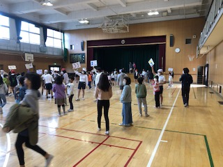 木曜日の朝は、集会委員会児童による児童集会があります。今年度は、一度に全校児童が集まるのはやめ、週を分けて、少ない人数にして行っています。