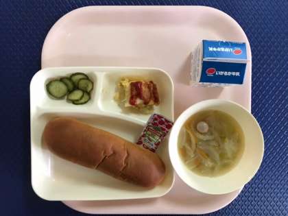 今日の給食は「ツナポテトオムレツ・スープ・きゅうりのバジル風味サラダ・黒糖パン・牛乳」でした。