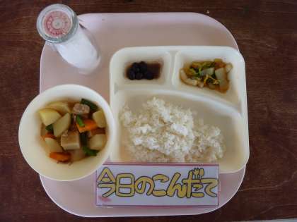 1月23日(金)の給食は「豚肉と赤平天の煮もの・きくなとはくさいのおひたし・黒豆の煮もの・ごはん・牛乳」でした。おせち料理では定番である黒豆をしっかりと柔らかくなるまで煮、自然な甘みをいかした味に仕上げました。残食も少なく子どもに人気の一品でした。
