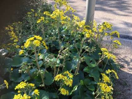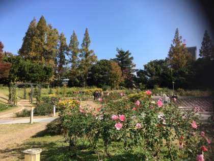 満開のツワブキの香りが迎えてくれました。けやきの落ち葉、秋咲のバラも見事です。