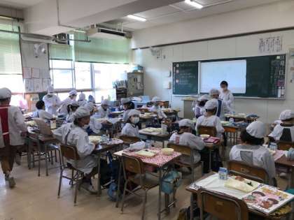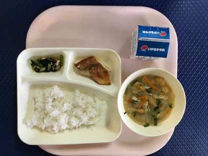 今日の給食は「赤魚のしょうゆだれかけ・みそ汁・こまつなのいためもの・ごはん・牛乳」でした。