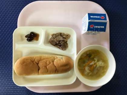 今日の給食は「豚肉のデミグラスソース・スープ・うずら豆のグラッセ・おさつパン・牛乳」でした。