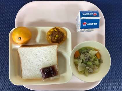 今日の給食は「豚肉と野菜のスープ煮・変わりピザ・みかん・食パン・いちごジャム・牛乳」でした。