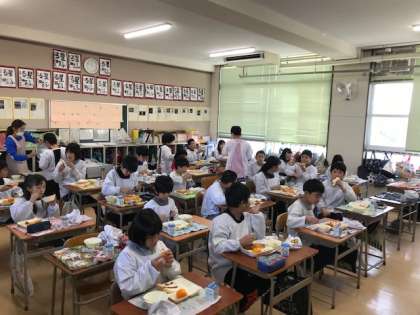 ぎょうざの皮を使って作った変わりピザは、子どもたちに好評の献立です。