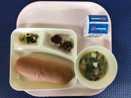 今日の給食は「あげシュウマイ・とうふのスープ・ツナとチンゲンサイのいためもの・黒糖パン・牛乳」でした。