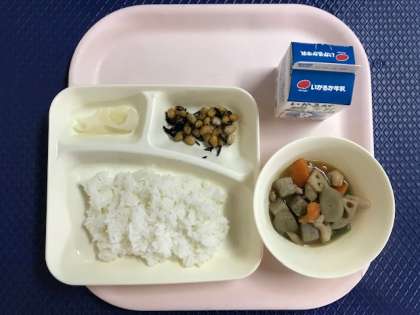 今日の給食は「筑前煮・ひじき豆・だいこんのゆず風味・ごはん・牛乳」でした。