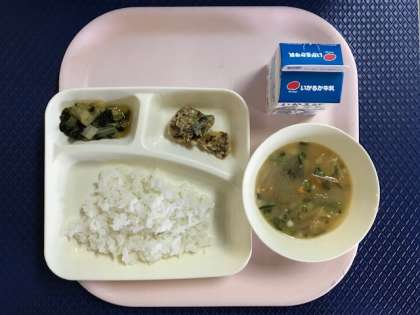 今日の給食は「さばのカレーたつたあげ・さつまいもとうすあげのみそ汁・はくさいとほうれん草の煮びたし・ごはん・牛乳」でした。