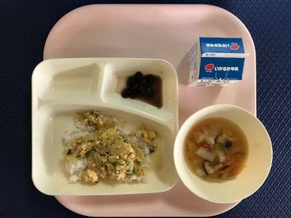 今日の給食は「親子丼・すまし汁・黒豆の煮もの・牛乳」でした。