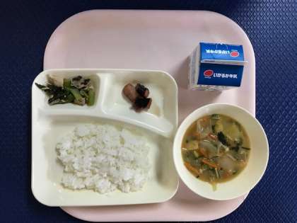 今日の給食は「泉だこのやわらか煮・みそ汁・小松菜の煮びたし・ごはん・牛乳」でした。
