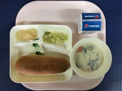 今日の給食は「ほうれん草クリームシチュー・キャベツのサラダ・洋なし(カット缶)・コッペパン・ソフトマーガリン・牛乳」でした。