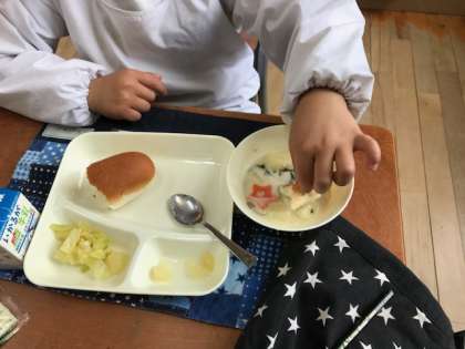 「こうやって食べるのもおいしいんやで!」とパンをシチューにつけての食べ方を教えてくれました。