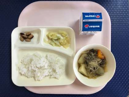 今日の給食は「肉じゃが・はくさいのゆず風味・とら豆の煮もの・ごはん・牛乳」でした。