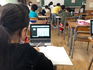 2年生の教室、パソコンを開き、デジタルドリルを使って学習していました。少しずつ操作も習熟してきています。
